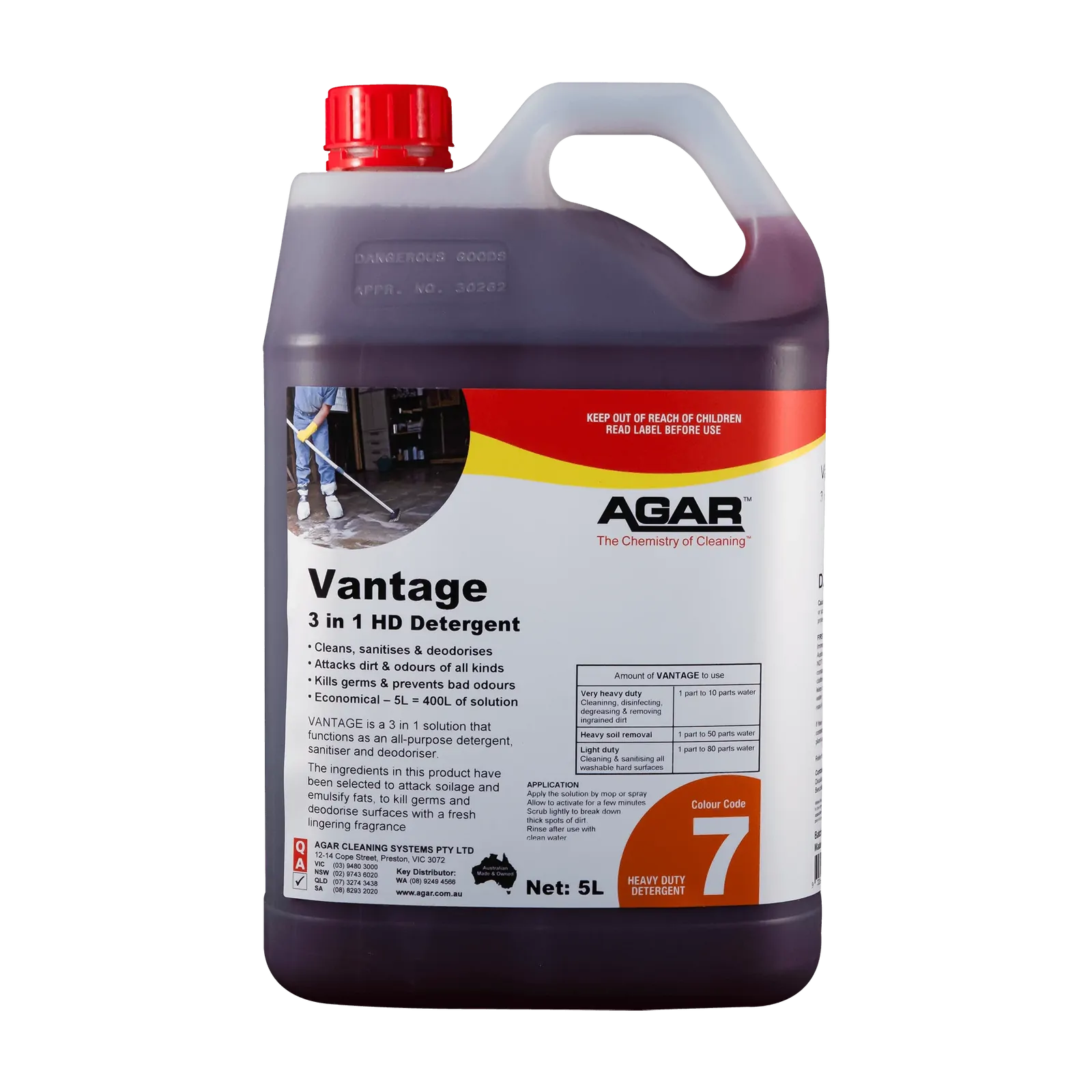 Vantage is a 3-in-1 product that functions as a detergent, sanitiser and deodoriser. The ingredients in this product have been selected to attack soilage and emulsify fats, to kill germs and deodorise surfaces with a fresh perfume.