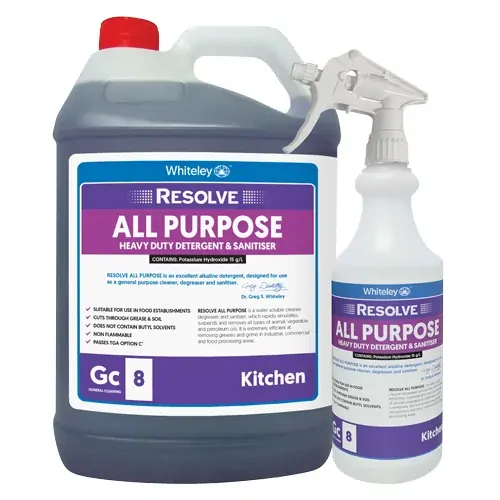 Resolve All Purpose is a powerful, water-soluble cleaner and degreaser that quickly emulsifies and removes animal, vegetable, and petroleum oils. Highly effective against grease and grime, it’s ideal for use in industrial, commercial, and food processing environments. This non-flammable, water-based formula is a safe and effective alternative to solvent-based cleaners and leaves no unpleasant odours.